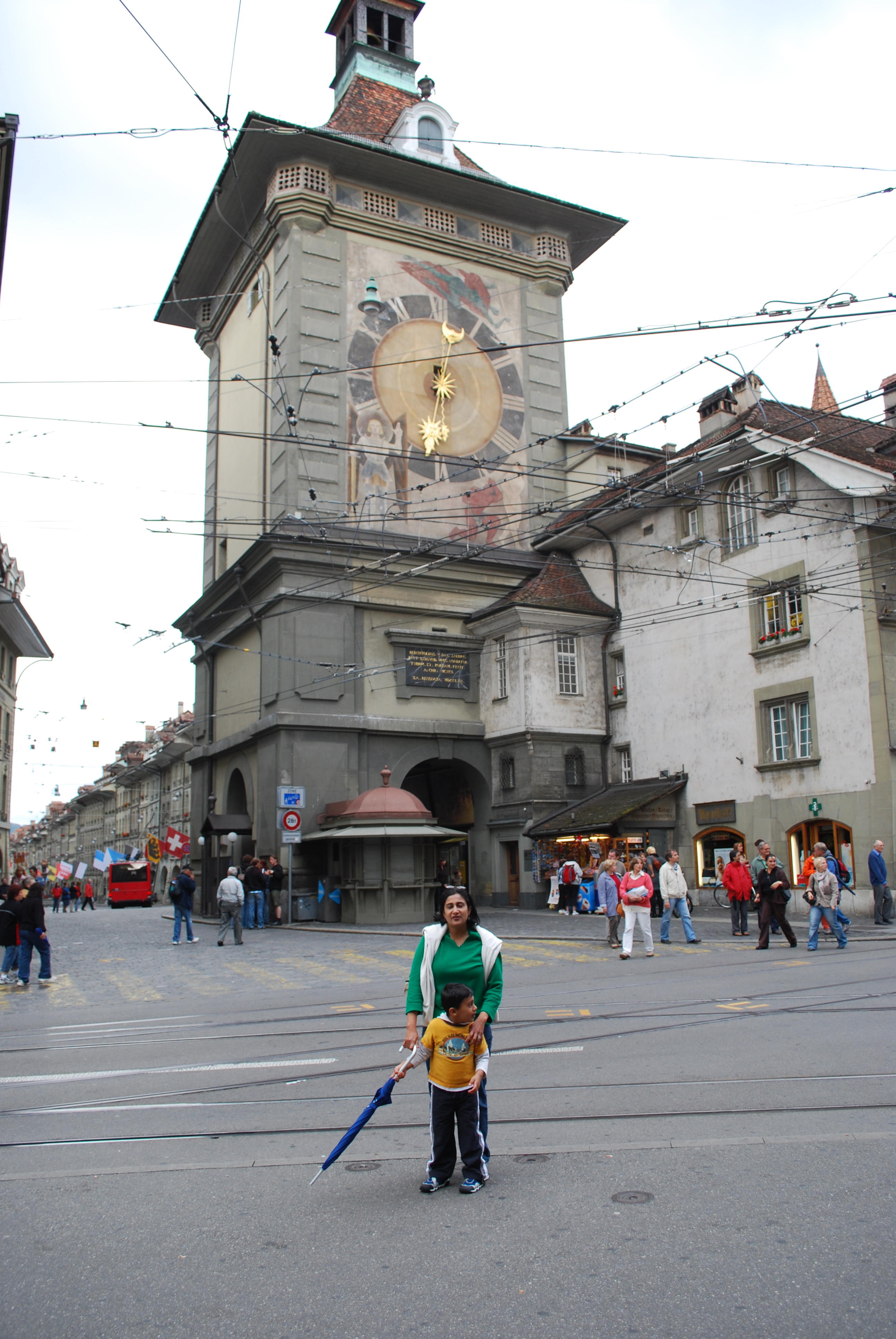Switzerland is in Cenral European Time, a good 9 hours ahead of pacific time. This in addition to the fact that we had not for much sleep on the flight meant that on Saturday, we were very jet-lagged. Rather than fight the jet lag, we decided to sleep in, and by the time we woke up it was well past noon. We decided to just amble into town in the afternoon, see the zytglogge, the medieval clock tower in the old town.